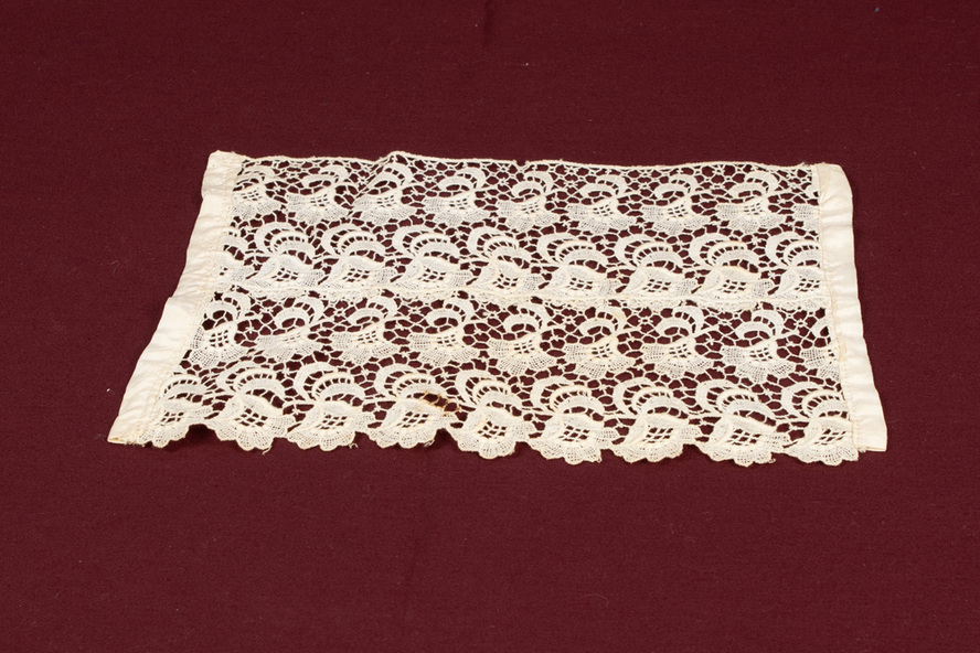 Ecru coloured, fine lace modesty panel. Rectangular in shape with handsewn satin binding on the two short ends and lacy edge on upper part and bound seam on the bottom edge.