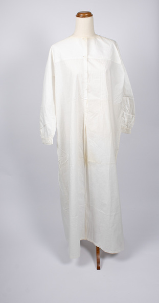 This cotton nightgown was worn by women in the 19th century. Its original owner is unknown, but it was purchased in the late 1990s by the donor who later moved to Emerald but, at the time, had a 2nd hand decoration shop in Camberwell when she purchased this as part of a group of garments which included bloomers, lace collars and cuffs, camisoles etc - all of which have been donated to the Museum. The donor was informed at the time of purchase that the garments were over 100 years old.