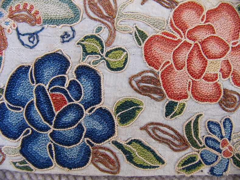 Sleeve band of grey brocade silk, embroidered design of peonies, and butterflies in coloured silk thread in Pekin knot stitch. Flowers are outlined in cream crinkle cord.