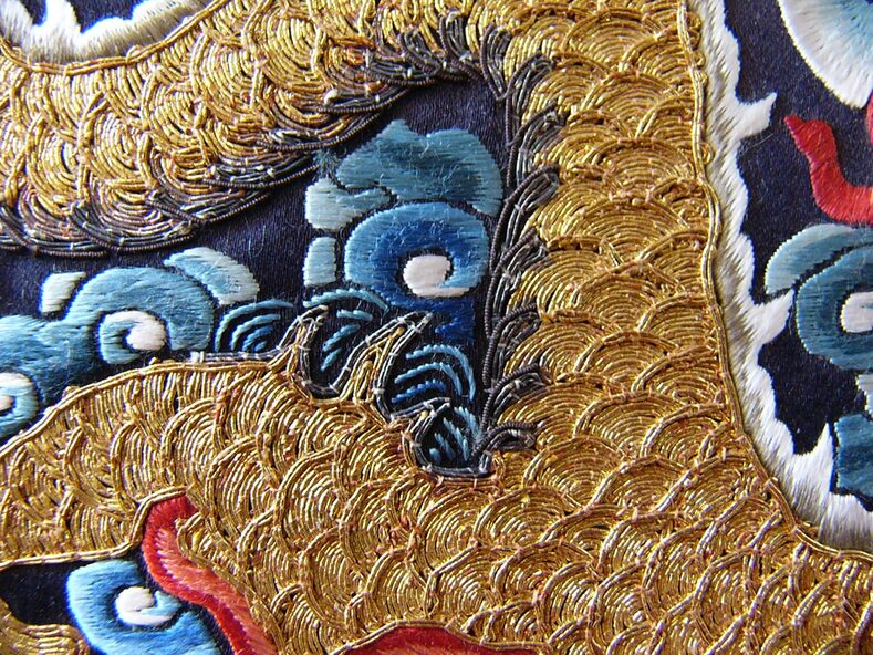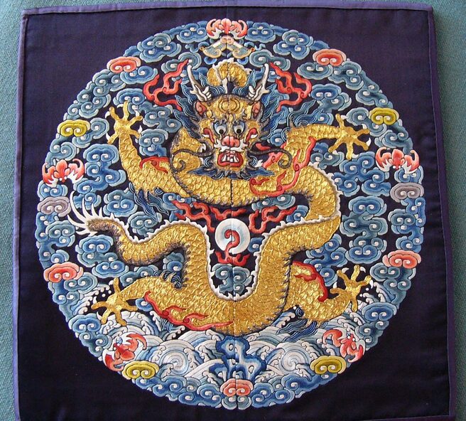 Imperial Dragon with pearl. Embroidered in two halves of a circle for mounting on either side of the front opening of a garment. Dark blue silk back ground, worked in silk floss in blues, gold and reds. Dragon embroidered in gold metal threads. The dragon is surrounded by clouds and bats.