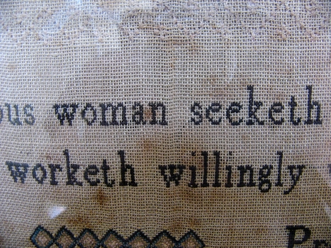 Beige linen with cross stitched alphabets,and borders in brown, blue and black. Also a verse - "A virtuous woman .....etc"