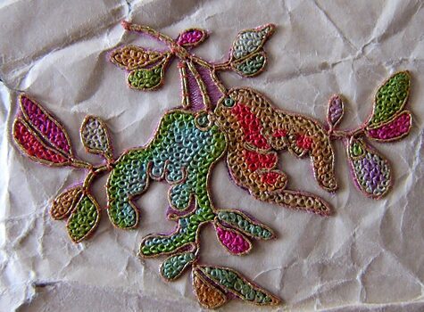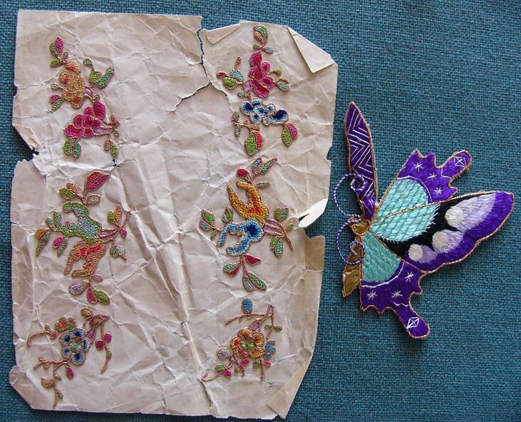 Six floral motifs and one butterfly. Embroidered in pekin knot, satin stitch and couched metal threads. The slips are glued to a rectangle of paper.