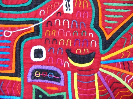 Red cotton background, with applique and reverse applique, and embroidery in bright colours