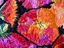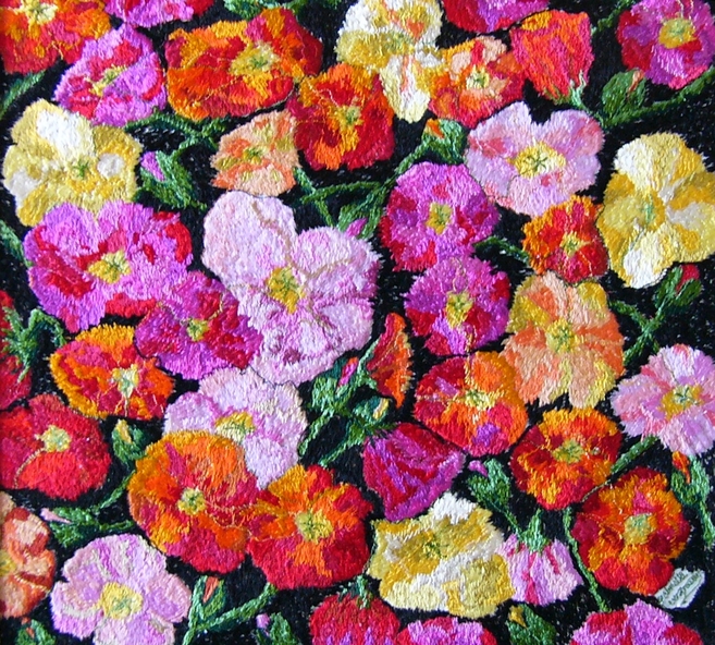 Richly coloured and embroidered panel of poppies in golds, reds and pinks, on a black ground. Totally covered with free machine stitching in the thread painting style.