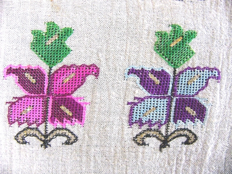Cream linen/Cotton bands of brightly coloured flowers in open cross stitch, sometimes call Turkish stitch.