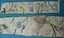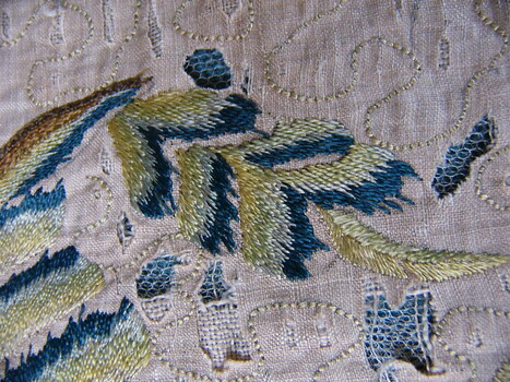 Two fragments of ecru linen,embroidered with silk flowers in soft shades of green, pink and blue. Meandering lines may be tambour work. Embroidered through two layers of linen.