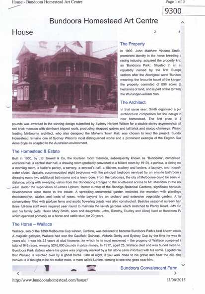 History of Bundoora Homestead from its purchase in 1899, the architecture of the homestead, its time as a horse stud, repatriation hospital and today as an arts centre restored by Darebin Council.