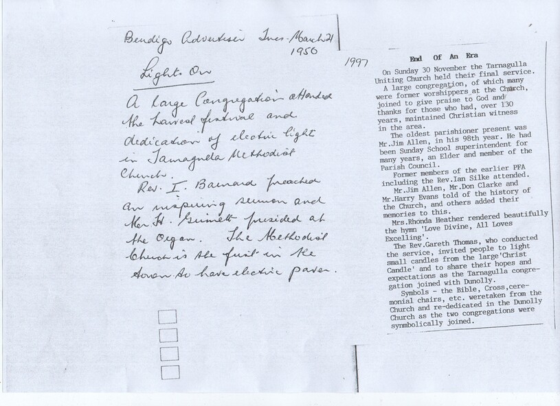 Notes on Tarnagulla's Churches. 1. Switching on of electricity, Methodist Church, 1950. 2. Final Service at Uniting Church, 1997