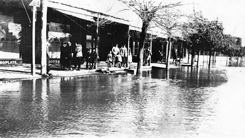 1923 flood, west end of High St. Spectators outside Wylie's store and Barber's jewellrey store. Photo taken by H. Barber Jeweller, part of a set of photos taken in June 1923.