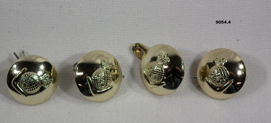 4 x medium sized bright shine gold military buttons with Royal Australian Survey Corps insignia on them. Each button has a slide clip at the rear to attach them to a uniform.