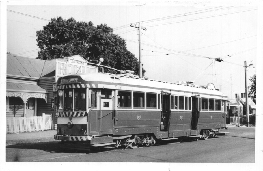 The photograph shows Ballarat tram 38 at the Mt Pleasant terminus with the return destination of Gardens. In the background is the general store advertising Robur tea and Peter's Ice creams. The photo was used on page 47 in Keith Kings 1971 book "Ballarat Tramways."