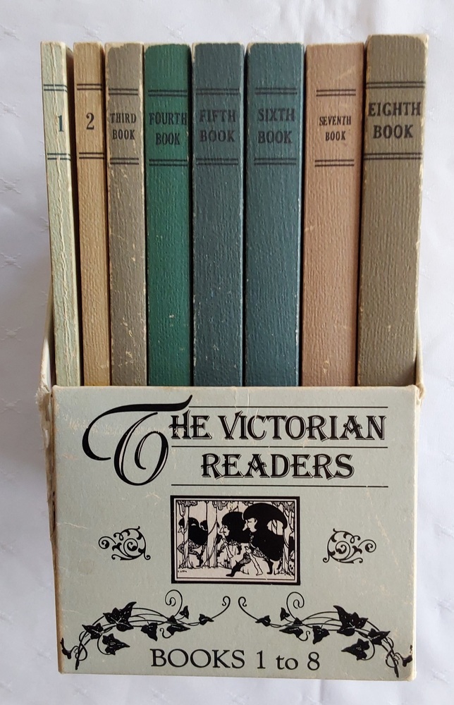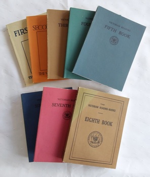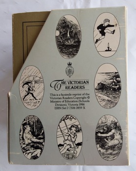 A set of 8 varying coloured paperback facsimile reprint of Victorian Readers 1 to 8 in a grey cardboard slipcase. Each book has printed in black lettering at the top of the front cover, First Book and so on through to the Eighth Book. Underneath the First and Second Book is an outline of a child reading. The Third to the Eighth Books have a black circle with Education Department Victoria surrounding a symbol. There are short stories, poems and black and white illustrations in them all. There are varying paginations.