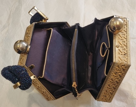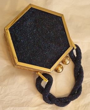 Hexagonal shaped bag with a gold coloured metal frame with navy blue beaded inserts and handle