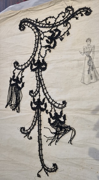 Beaded black motif/slip, tacked to calico with black and white drawing of how to be applied.