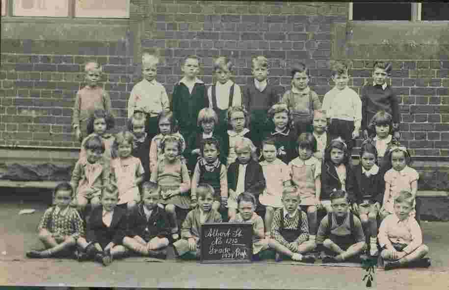 Black and white school photgraph of the Prep Class at 1213 Albert Street, Brunswick school, 1939. On the back is written 'Doris is second from the right in the second bottom row. She has white shoes on.' Doris is Doris Smith, born c1934.