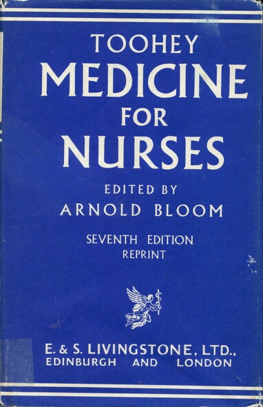 Previous catalogue number, typed on white paper, has been fixed with tape to base of dust jacket spine. inside front cover at base is a small bookseller sticker. at the top of the front end page is the name Alison George [handwritten in black ink] 63/- [in pencil ?price] at the bottom of this s a printed black and white donation sticker: black Maltese cross in circle, "This book was donated to Alfred Archival Association Nursing Division by" Alison George (handwritten in black ink). Previous catalogue number is also handwritten in black ink on this sticker.