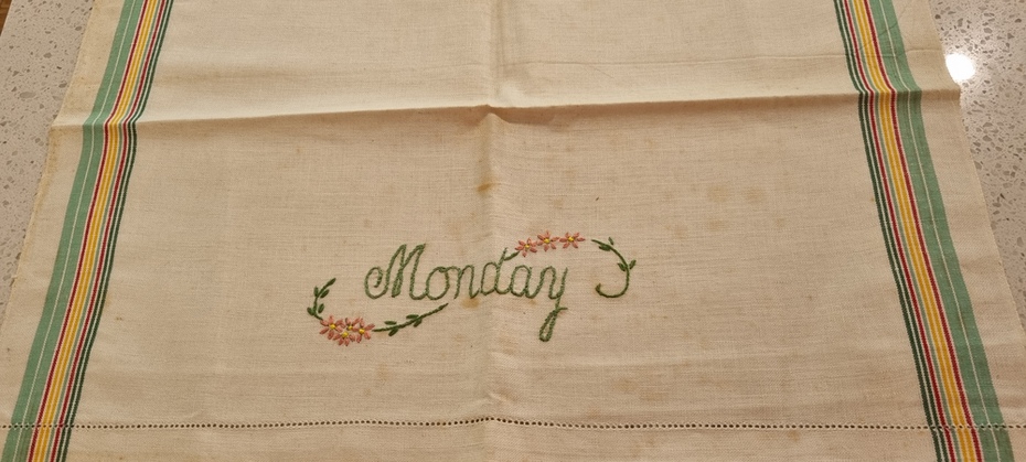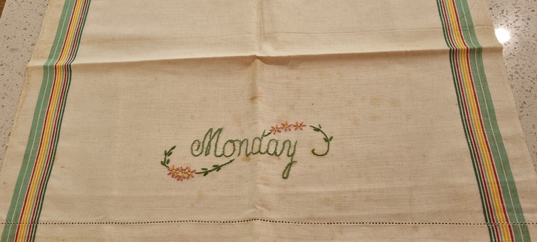 Set of tea towels with printed design of days of the week. Embroidered by Veronica Constable (b1904-d1976) who lived in Wycheproof, Victoria. Embroidered circa 1930-1950. Never used.