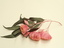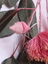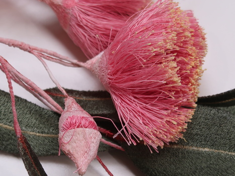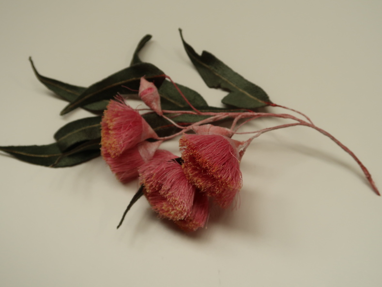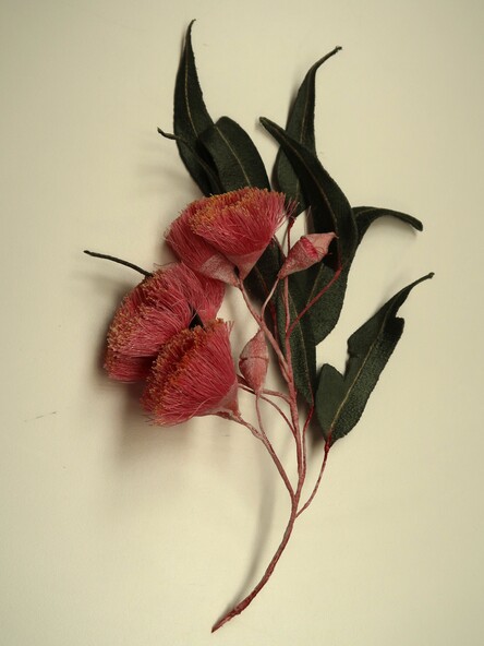 Botanical model of Eucalyptus Caesia "Silver Princess" in flower with open flowers, flower buds and leaves. Embroidered using machine embroidery on an organza base. Wrapped wires and hand embroidered elements, hand coloured.
