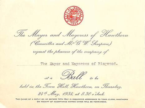 The Ball was to be held on Thursday, 24th May, 1934 at 8.30 pm. The favor of a reply was requested on or before 14th May
