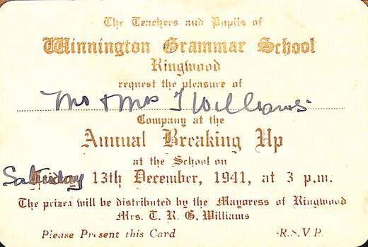 The event was held at the school on Saturday 13th December, 1941 at 3 pm. The prizes were distributed by the Mayoress of Ringwood, Mrs T. R. G Williams