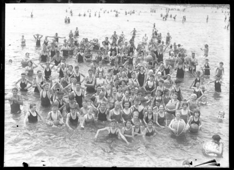 Approximately 150 men, women and children grouped in front of the photographer in the shallows of St Kilda Beach on Christmas morning 1933. All are wearing one piece bathing suits, some have bathing caps, some hold beach balls, and one boy has a model boat. They are happy and exuberant. Their swimming attire is traditional and conservative for the time. However at this time the bathing attire was undergoing a substantial change, as Wikipedia’s History of Swimwear attests.
