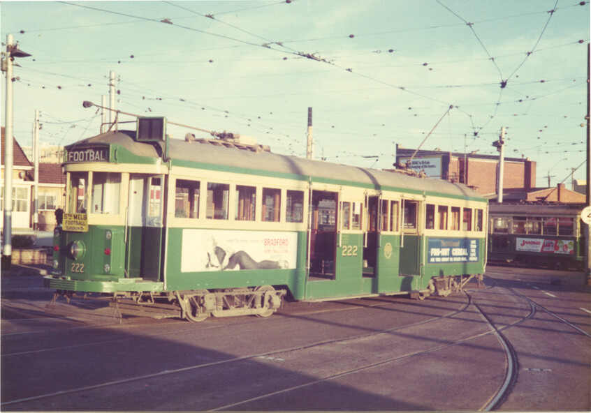 Colour print of W2 class tram 222 on the depot fan at East Preston workshops. Has the destination of Football and an auxilliary sign of "Sth Melb. Football Ground" and a Bradford advert. The tram has been fitted with marker lights.