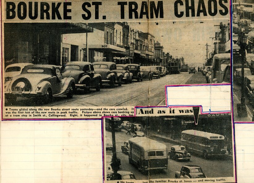 Scrapbook contains photographs and written article related to the Bourke Street trams in Melbourne, Victoria. These have been collected from various newspaper outlets - The Argus, The Age, The Herald, The Sun News-Pictorial, all printed in Melbourne.