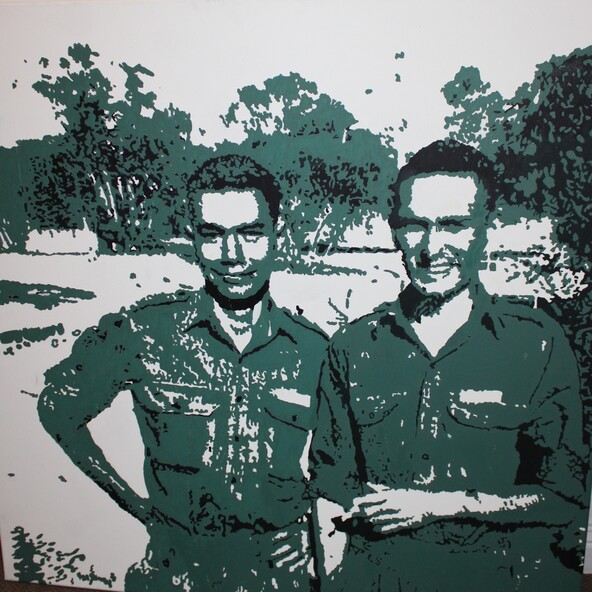 Work in 2 shades of khaki green and black on a white background features two smiling young men in army uniforms with trees in the background.