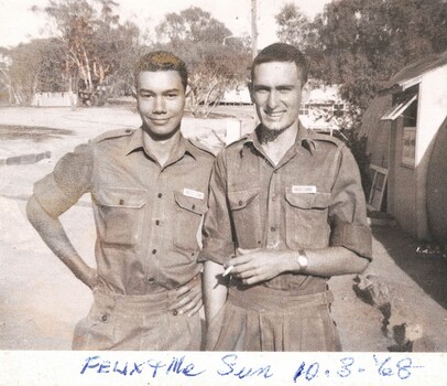 "Recruit training, both aged about 19, Felix (left) died in a single vehicle accident soon after his return from service in Vietnam with the SAS. Motor accidents were a problem for servicemen after 12 months of adrenalin, then normal on return."