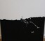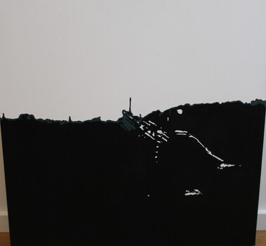 Image mostly black with some dark khaki on a white background features a machine gun resting on the top of a darkened pit as if at a horizon line, with a distant landscape outline above it.