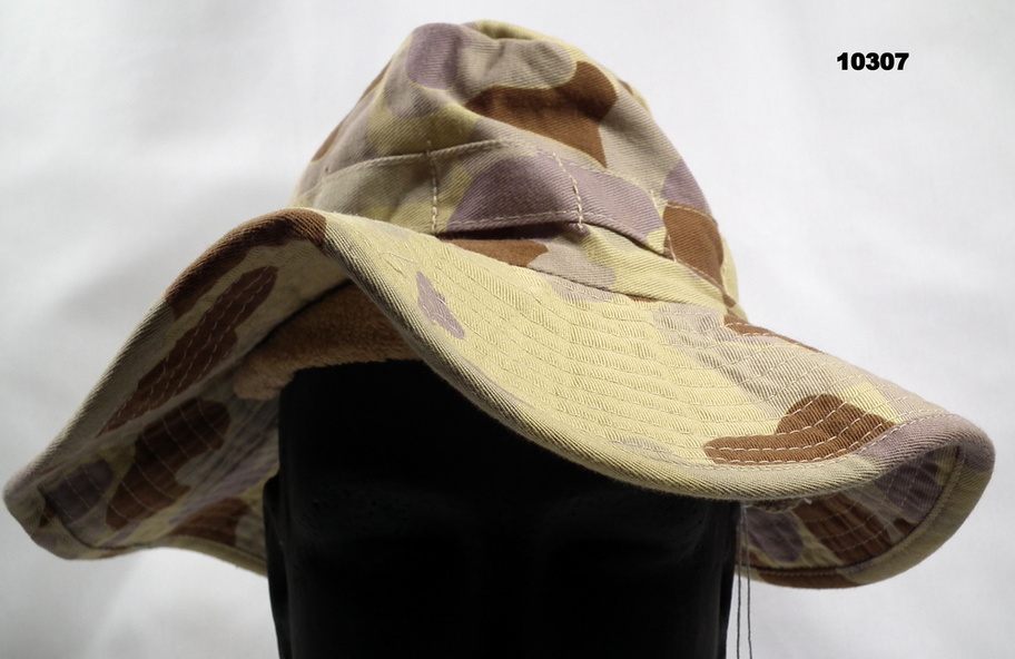 Large brim, bush hat, desert style camouflage. it has a cord to hold it on a head. It has towelling under the crown and around forehead section of the hat.