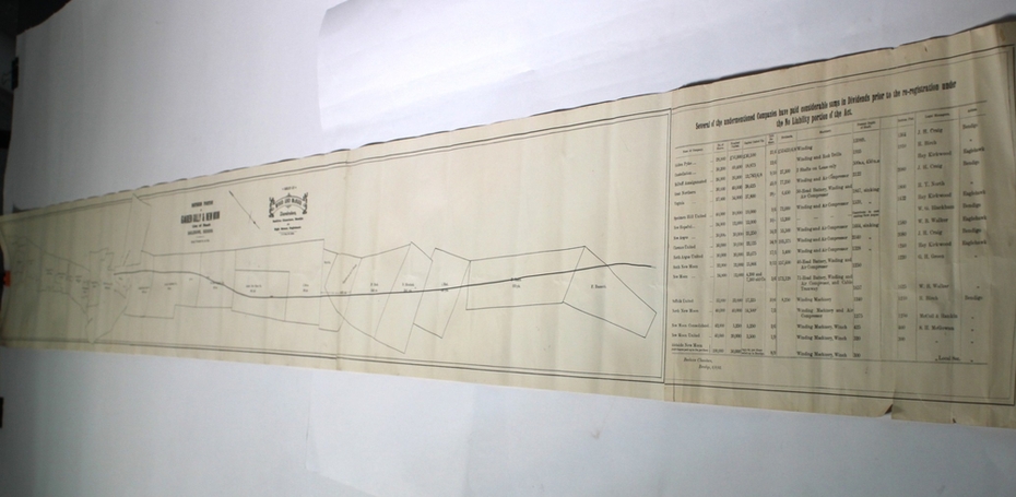 Plan shows mines along the reef lines with distance in yards of each claim - from SSW direction: Golden Pyke Company, McDuff Amalgamated, Constellation Company, Virginia Company, Specimen Hill Company, New Hopeful, New Argus Company, Clarence Company, North Argus Company, South New Moon Company, New Moon Company, Suffolk Tribute Company, North New Moon Company, New Moon Consolidated Company, New Moon United Company, Adelaide New Moon Company, J. Davies, Day & Co., (lease applied for by P. Booth), P. Booth, D. Murdoch, J. Mani, F. Bassett and R. Bassett.