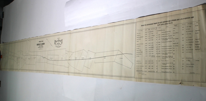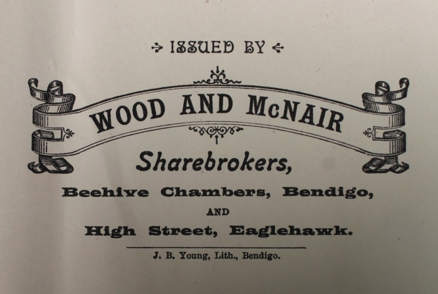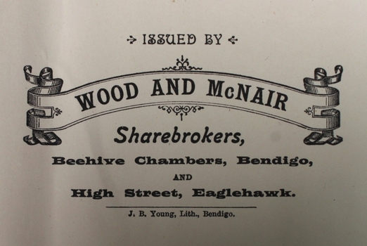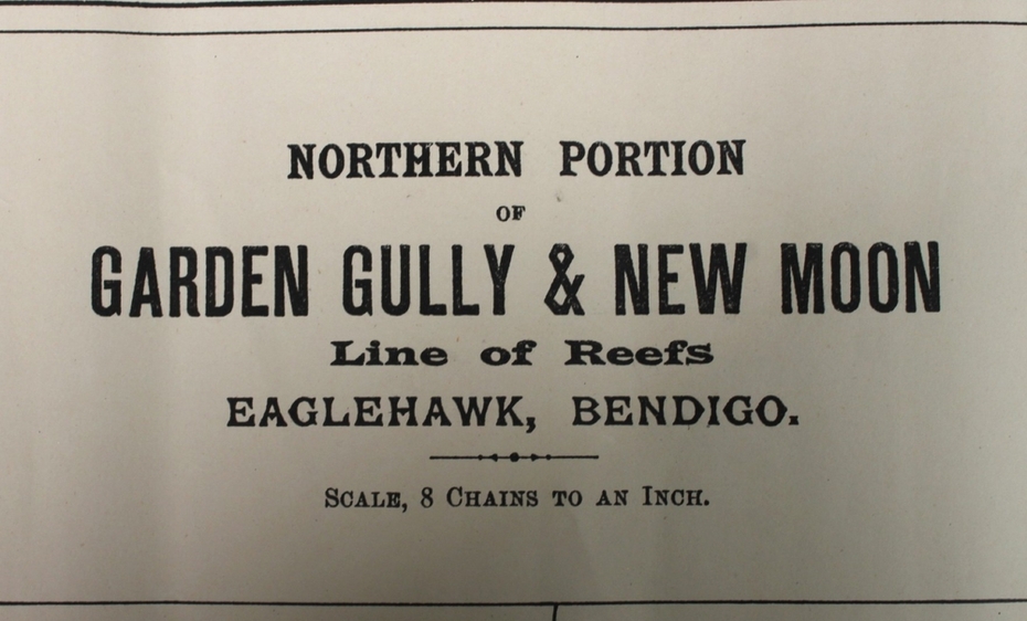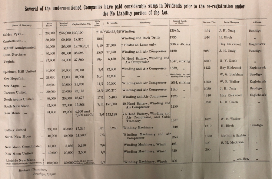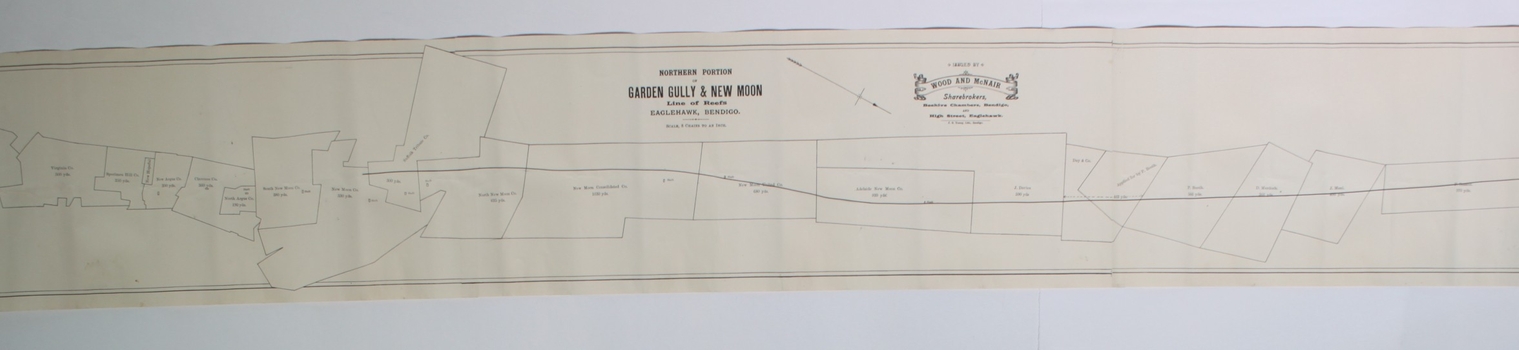 Printed on buff coloured light paper, written on top centre of plan: ' Northern Portion of Garden Gully & New Moon Line of Reefs, Eaglehawk, Bendigo, Scale 8 chains to an inch'. Printed on right hand side of reef names: ' Issued by Wood And McNair, Sharebrokers, Beehive Chambers, Bendigo and High Street, Eaglehawk. J.B. Young, Lith. Bendigo.' On far right hand end of map, a table of information headed ' Several of the undermentioned Companies have paid considerable sums in Dividends prior to the re-registration under the No Liability portion of the Act'. Table contains information on the name of Company; No. of shares; nominal capital,; Capital called up; call per share; dividends; machinery; present depth of shaft; bottom plat; Legal Managers; address. On bottom of table, 'Beehive Chambers, Bendigo 6/8/03'.