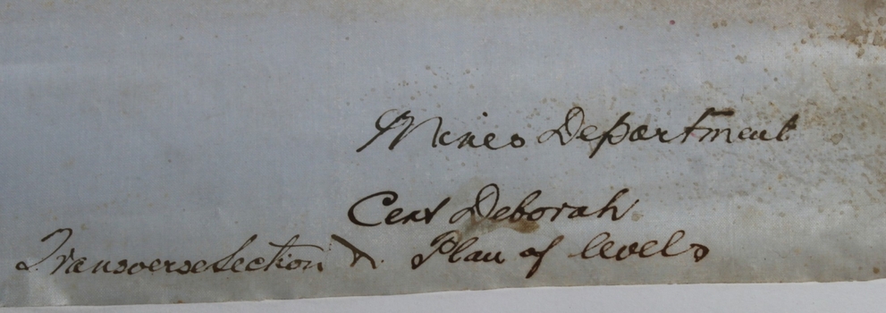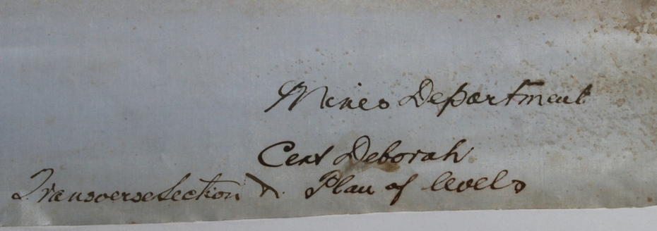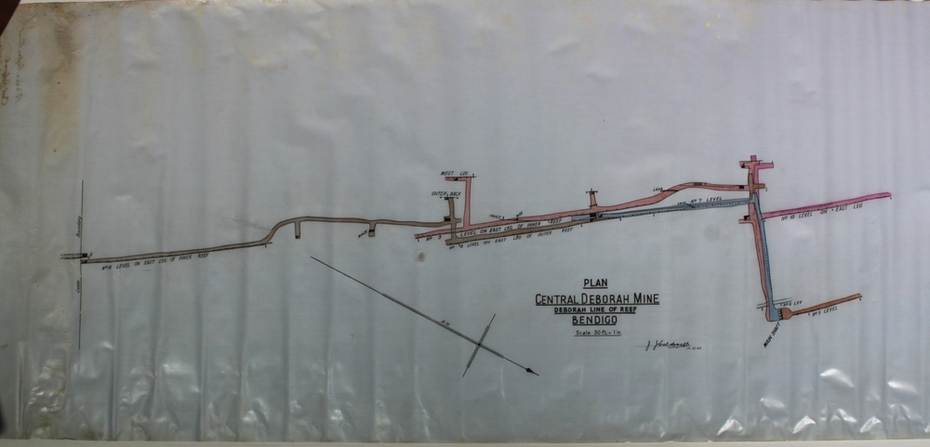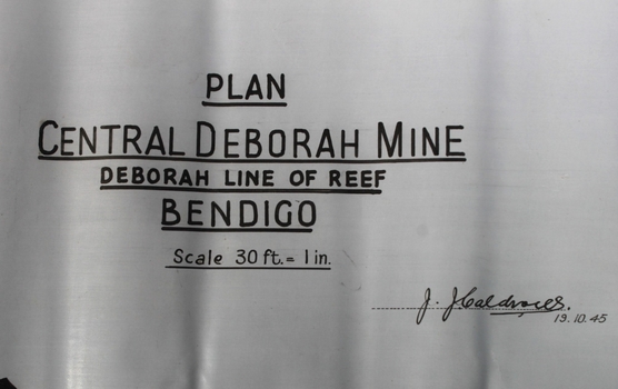 Blue waxed paper, features on plan drawn in pale pink and blue, title written in black text on centre bottom: 'Plan, Central Deborah Mine, Deborah Line of Reef, Bendigo, Scale 30 ft = 1 in.' Signature of J.J. Caldross, 13.10.45, written below name of mine. Handwritten on outside of plan in black pen: 'Mines Department, Cent. Deborah, Transverse section, Plan of levels' Plan notation shows No. 8 level on east leg of inner reef, level of east leg on outer reef, outer back, west leg, main shaft, numbers 5, 6, 7 and 10 levels.