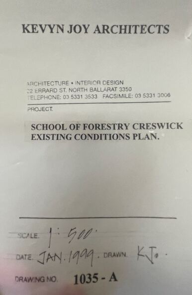 School of Forestry Creswick Existing Conditions Plan, Kevyn Joy Architects, Scale, 1:500, Jan 1999, Drawing No: 1035A