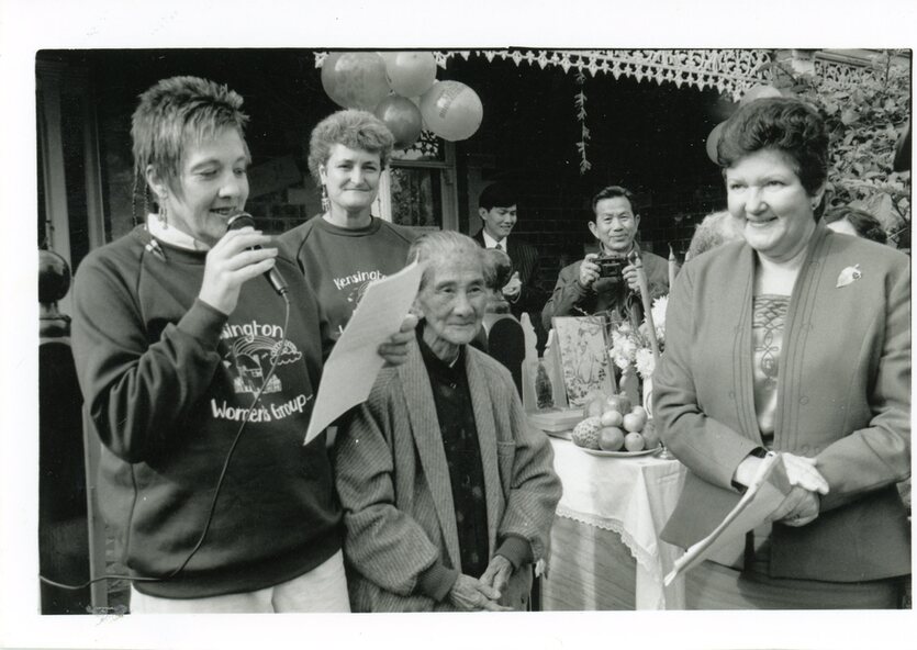 Black and white photograph of Carolyn Fuller (KNH Manager) speaking at the official opening of the 2nd story extension at 89 McCracken Street Kensington. Carolyn Fuller, Beryl Forster, Juan Huong, Victorian Premier Joan Kirner.