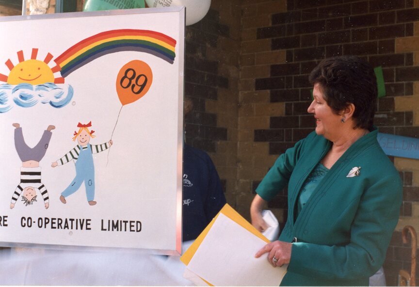 Colour photograph of Victorian Premier, Joan Kirner unveiling a new sign at the front of 89 McCracken Street, Kensington on the occasion of the official opening of the 2nd story extension, Nov 1992