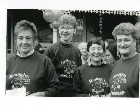 Black and white photograph of Carolyn Fuller (left), person unknown, Helen Frawley and Beryl Forster outside 89 McCracken Street at the official opening of the 2nd story extension. Nov 1992. Women are wearing navy sweatshirts with "Kensington Women's Group" logo.