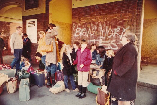 2 x colour photographs - 1 showing two women carrying luggage up the entrance ramp at Kensington Station; 1 showing women and childen with luggage on the platform at Kensington Station. Photos labelled "DOXA May 1981"