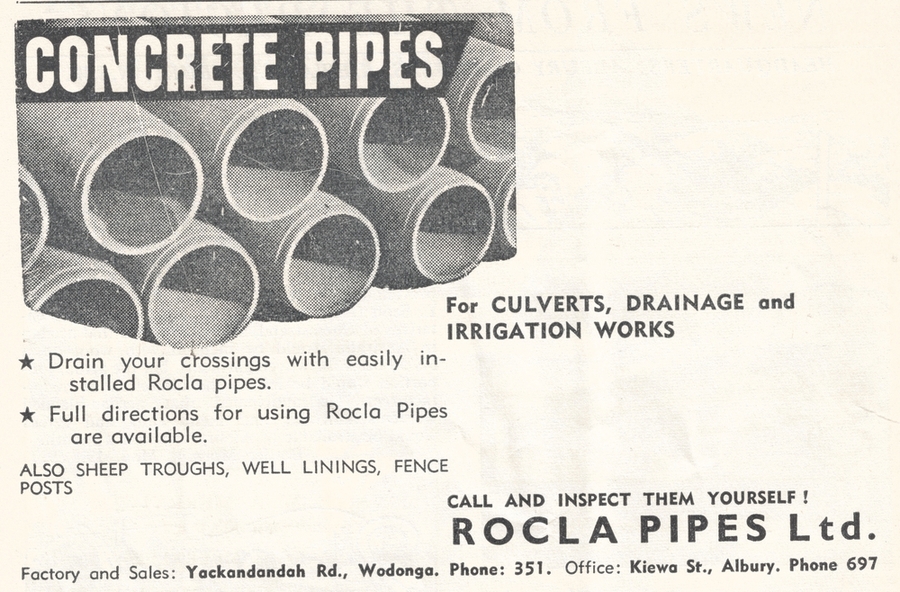 The company first came to the Albury – Wodonga area in late 1927 when tenders were called for the construction of their works and office in Kiewa Street, Albury. They were a popular provider of concrete pipe culverts and reinforced concrete troughs for farm use.