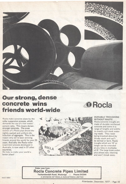 Another early major contract for ROCLA was with the Victorian State Rivers and Water Supply Commission for the provision of pipes for the new sewerage system in the new town of Tallangatta, relocated due to the enlargement of the Hume Weir. This contract called for the supply of 21,000 six inch pipes and 7,000 nine inch pipes. At this time ROCLA employed 15 men and this job required about 80 bags of cement per day.