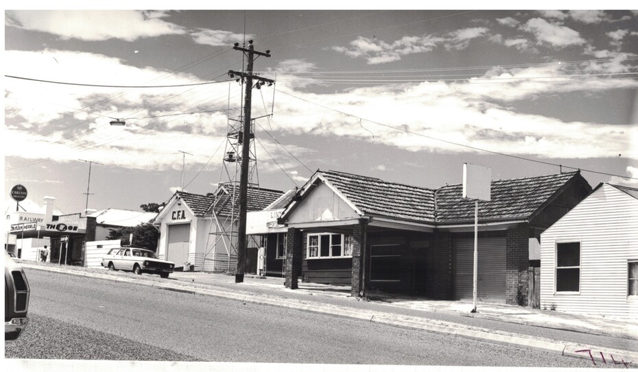 Photograph, Buildings in Sussex Street, Linton : Murrell's newsagency, CFA building, house and former Bennett's garage, 1982