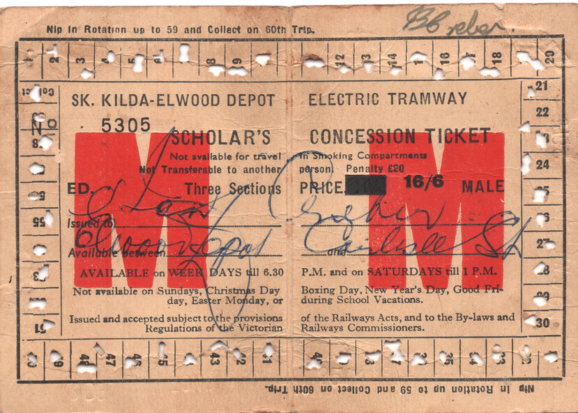Ticket - Scholars Concession Ticket - Victorian Railways St Kilda Elwood Electric Tramway printed on a folded cardboard manila coloured sheet. Printed in red and black ink. Three Sections, value 16/6, for a Male student. No. 5305.