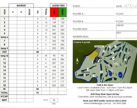 Score card from 2013 with Heidelberg Golf Club course layout and local rules