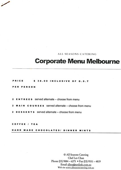Corporate catering menus prepared for Heidelberg Golf Club by All Seasons Catering, Chef Les Chan in 1998.