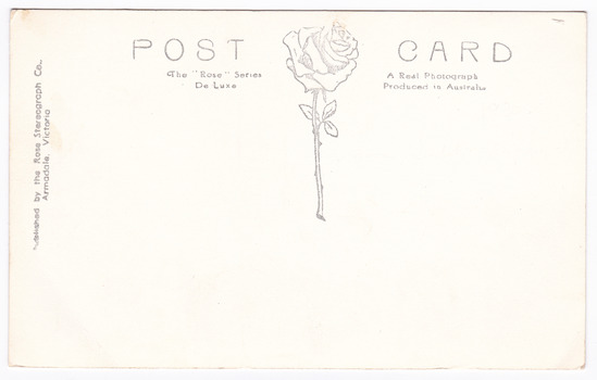 A black and white postcard from Kooringa Guesthouse in Marysville. The original house was built in 1914 for Frederick Webb by the Cuzens Brothers. The postcard was produced by the Rose Stereograph Co. as a souvenir of Marysville.