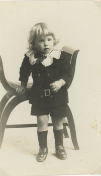 Black and white postcard of Samuel Lindsay Neal , a toddler dressed in the popular style of the 1900's. Plus small black and white photograph of 10 adults and 1 child on a tennis court.