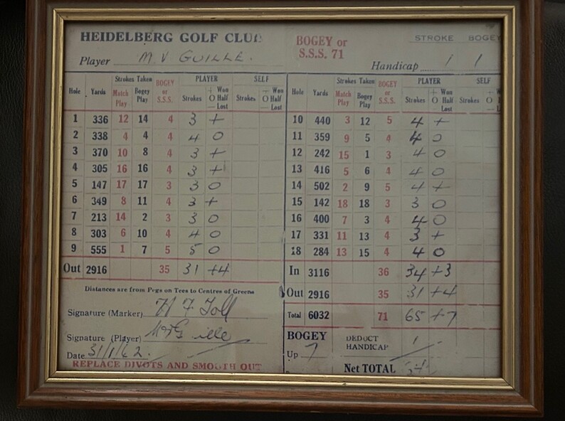 Score card from Max Guille's course record of 64 nett at Heidelberg Golf Club on 31/01/1962. Max was a Life Member, Captain, Director and Club Champion at HGC.