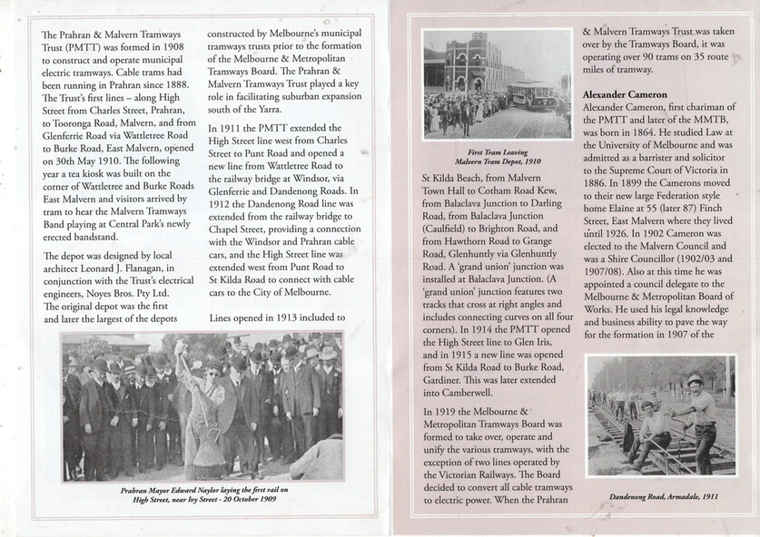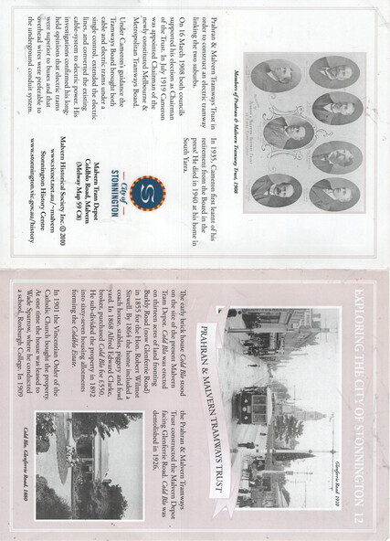 Pamphlet titled "Exploring the City of Stonnington 12" looking at the history of the Prahran and Malvern Tramways Trust, the origin of Coldblo Road - from a house name Cold Blo, which became the site of Malvern depot, the formation of the PMTT, its tramways, takeover by the MMTB, Alexander Cameron, and members of the trust. Published by the City of Stonnington 2010.