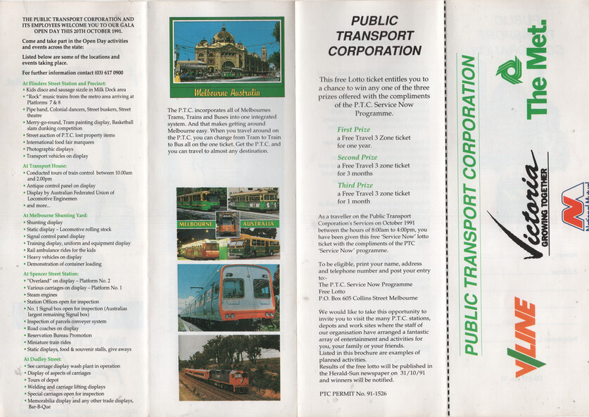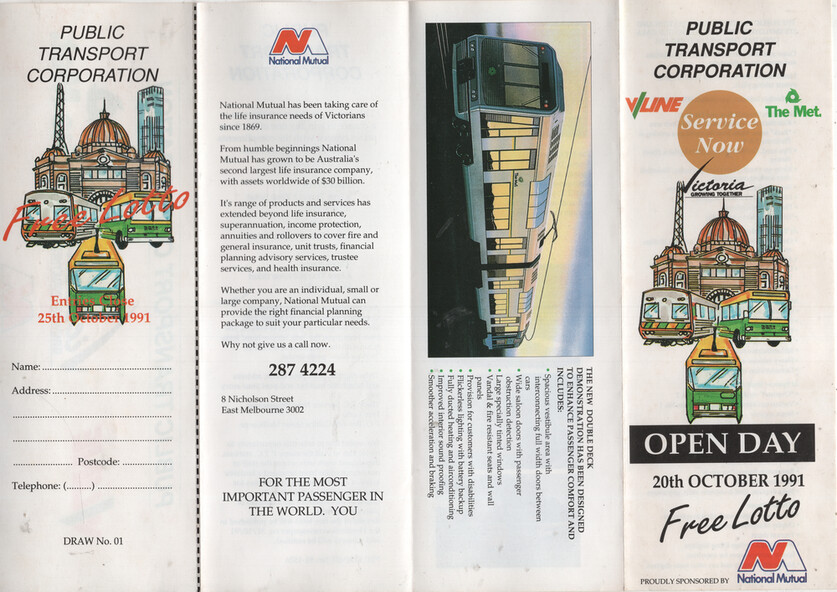 Pamphlet titled "PTC Open Day", issued to promote an Open Day to be held on 20/10/1991. Has details of events and locations and the PTC Service Now programme. Sponsored by National Mutual. Has a tear off section to enter for a free lotto.